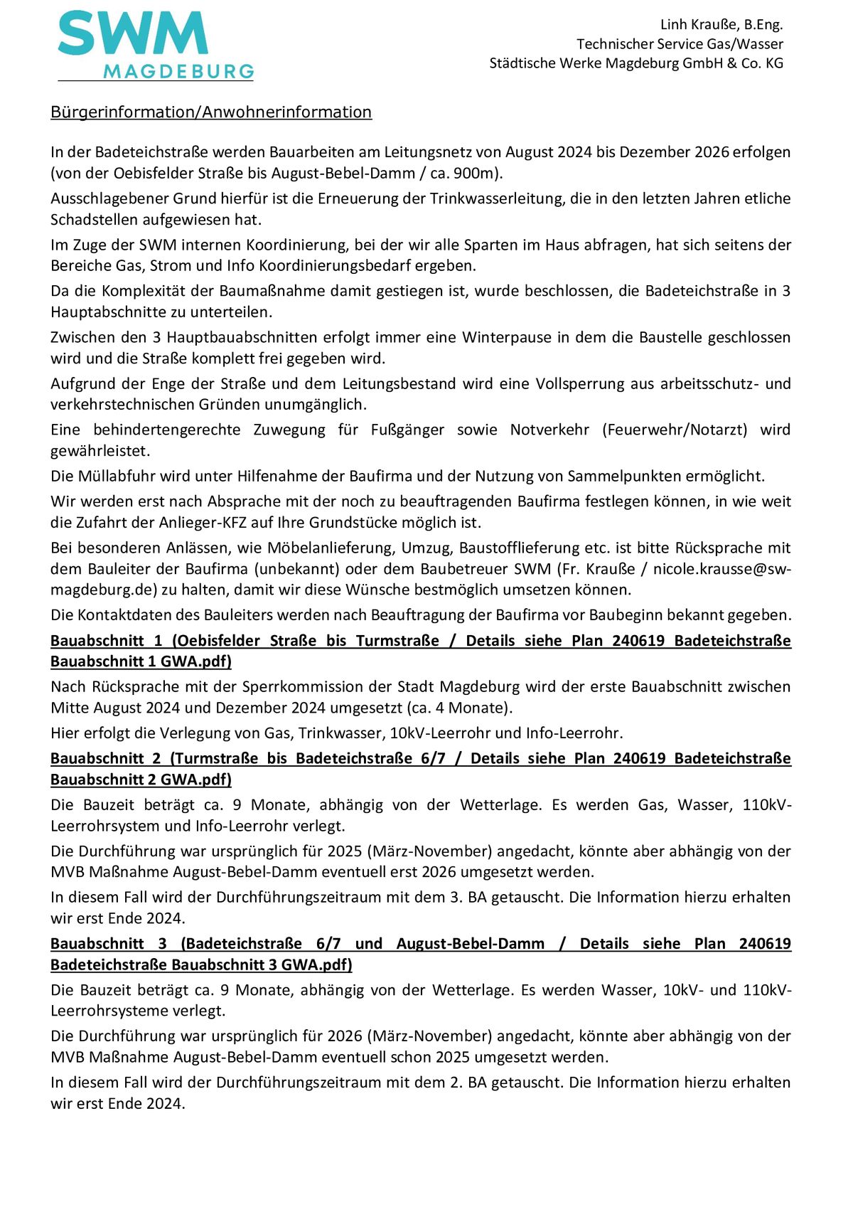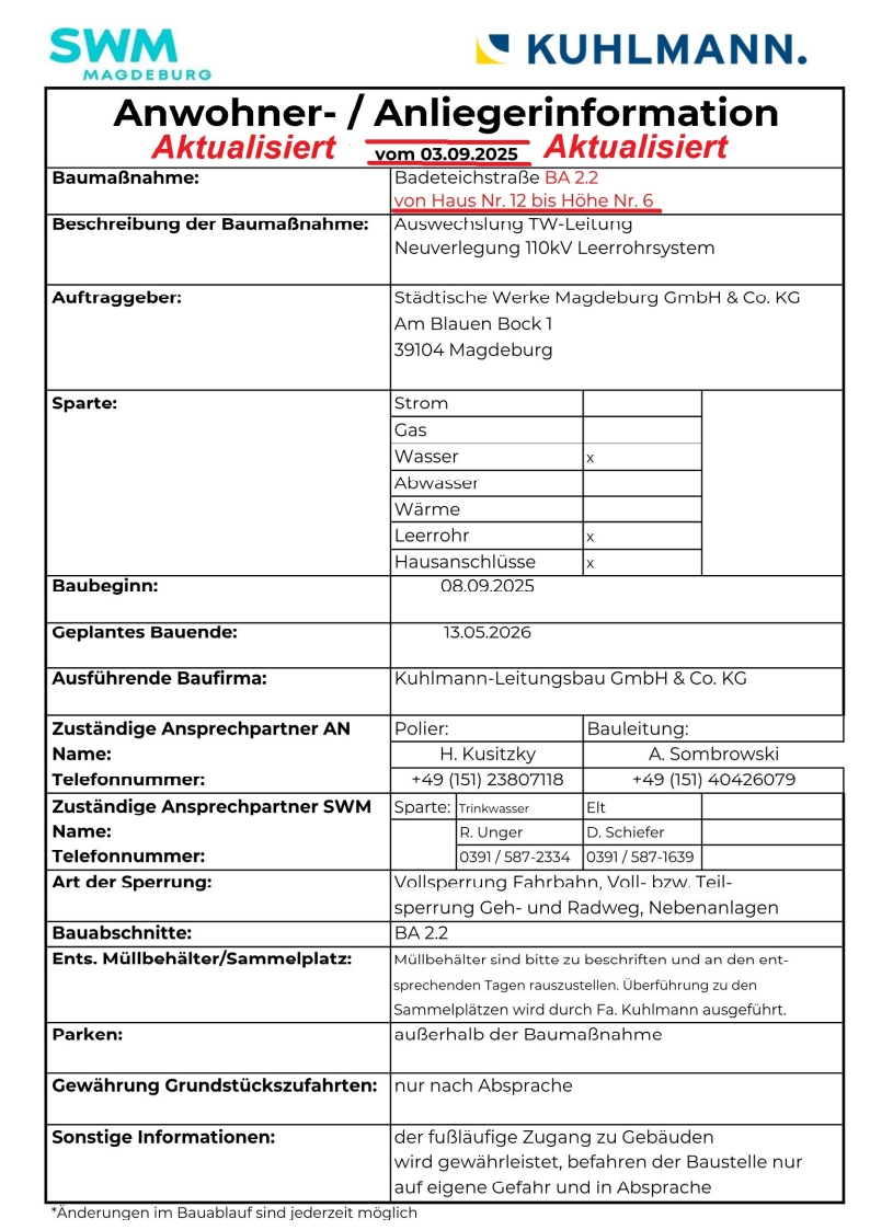Baustellenupdate März 2026: Fa. Kuhlmann wird ab Montag, den 02.03.2026 die Arbeiten in der Badeteichstraße wiederaufnehmen (Einrichten der Baustelle), Ab Dienstag sind dann die ersten Tiefbauarbeiten geplant.
